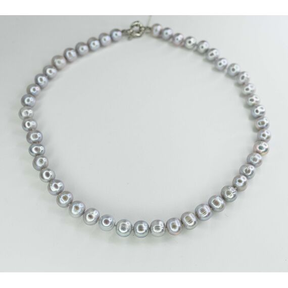 Бусы из природного речного жемчуга почти сферической формы (8мм). Бусины теплых серых оттенков с блеском перламутрового слоя. Длина-45,0см. Замок из гипоаллергенного ювелирного сплава серого цвета- карабин.