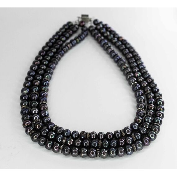Бусы ( колье) из трех нитей природного речного жемчуга. Бусины теплых баклажановых оттенков с блеском перламутрового слоя со вставками из цирконов белого цвета. Длина- 50,0см. Застежка из гипоаллергенного ювелирного сплава серого цвета с разъёмным механизмом.