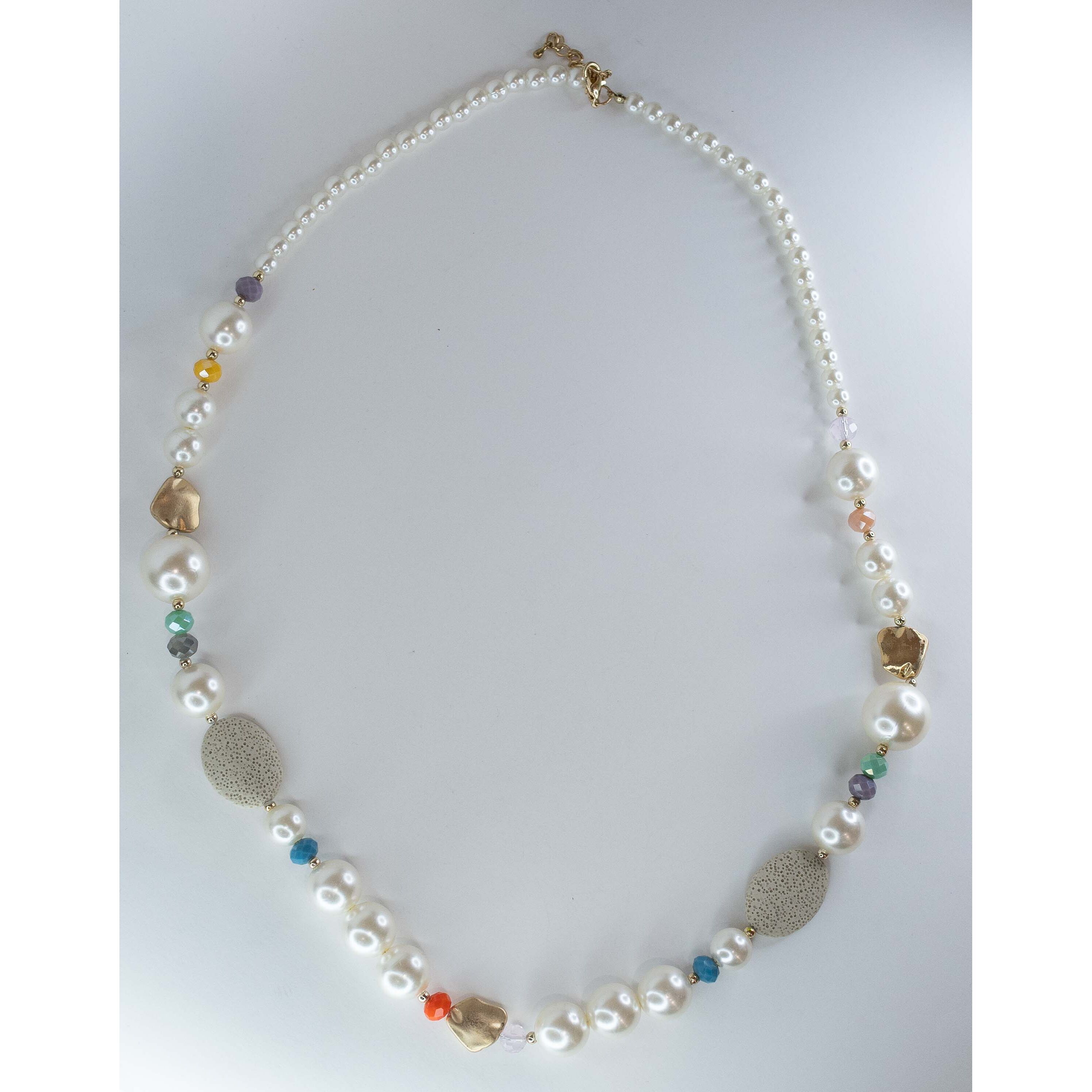 Бусы состоят из бусин иск. жемчуга белого цвета, ювелирного стекла красного, голубого цвета и лавы серого цвета. Длина бус-90,0см. Застежка- карабин.
