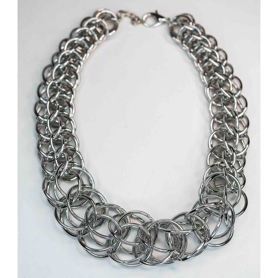 Колье из гипоаллергенного ювелирного сплава серого цвета. Состоит из звеньев - колец , диаметром от 2см на увеличение к центру колье до 3см. Длина колье - 50см.