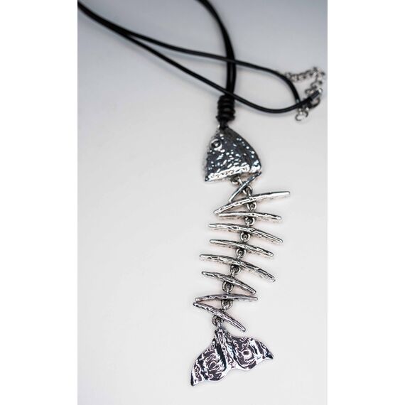 Колье из гипоаллергенного ювелирного сплава и кожи. Состоит из кожаного шнура черного цвета и подвески (рыба) серого цвета. Высота подвески-13см, ширина-4см. Длина шнура-80,0+5см, замок- карабин.
