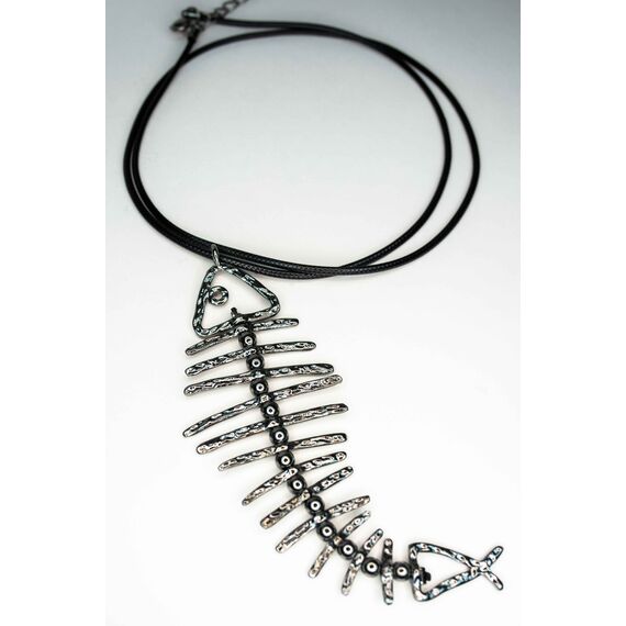 Колье из гипоаллергенного ювелирного сплава и текстиля. Состоит из плетеного текстильного шнура черного цвета и подвески (рыба) серого цвета. Высота подвески-17см, ширина-5,5см. Длина шнура-80,0+5см, замок- карабин.