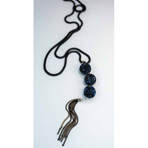 Колье из гипоаллергенного ювелирного сплава черного и желтого цвета. Подвеска из пластика со вставками из ювелирного стекла синего цвета, завершена цепочками . Длина цепи--70,0см, замок- карабин. Длина подвески-15см.