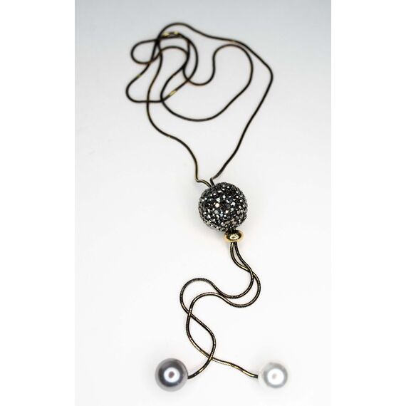 Колье из гипоаллергенного ювелирного сплава черного и желтого цвета. Движущаяся подвеска из пластика со вставками из ювелирного стекла черного цвета. Колье незамкнутое, завершено подвесками из иск. жемчуга белого и серого цвета. Длина колье-90,0см.