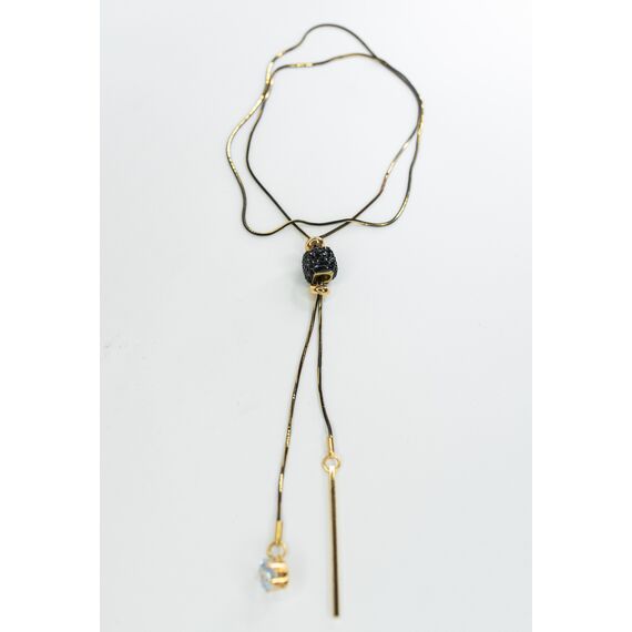 Колье из гипоаллергенного ювелирного сплава черного и желтого цвета. Движущаяся подвеска из пластика со вставками из ювелирного стекла черного цвета. Колье незамкнутое, завершено подвесками из ювелирного стекла белого цвета и ювелирного сплава желтого цвета.. Длина колье-90,0см.