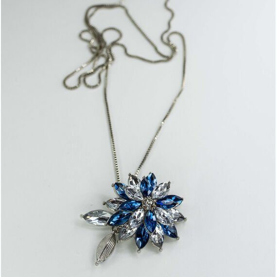Колье ( цепочка+подвеска) из гипоаллергенного ювелирного сплава серого цвета. Вставка- ювелирное стекло белого и голубого цвета. Высота подвески-3,5см, ширина-3,5см. Длина цепи (снейк) -90,0см., регулируется движущейся подвеской( цветок). Колье незамкнутое, завершено подвесками ( высота-1,5см). Замок- карабин.