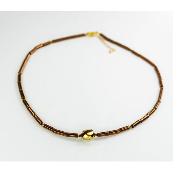 Колье-чокер из гипоаллергенного ювелирного сплава коричневого цвета.Состоит из звеньев, в центре- бусина желтого цвета из ювелирного сплава. Длина колье- 40,0+5см. Замок у колье- карабин.