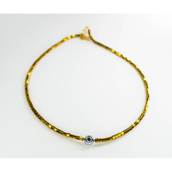 Колье-чокер из гипоаллергенного ювелирного сплава желтого цвета.Состоит из звеньев, в центре- шарик серого цвета из ювелирного сплава. Длина колье- 40,0+5см. Замок у колье-шпрингельный.