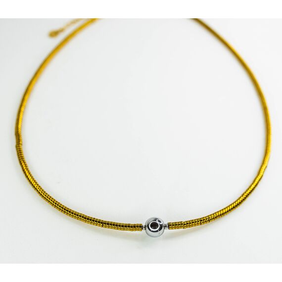 Колье-чокер из гипоаллергенного ювелирного сплава желтого цвета.Состоит из звеньев, в центре- шарик серого цвета из ювелирного сплава. Длина колье- 40,0+5см. Замок у колье-шпрингельный.
