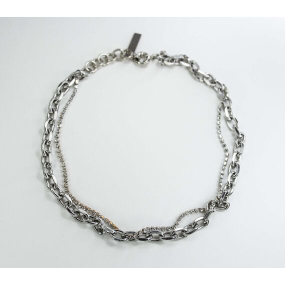 Колье из гипоаллергенного ювелирного сплава серого цвета. Состоит из цепи якорного плетения и цепочки со вставками из ювелирного стекла белого цвета. Длина -40,0см, замок - шпрингель.