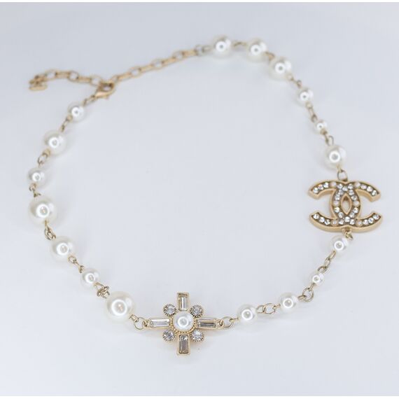 Колье женское из гипоаллергенного ювелирного сплава желтого цвета. Вставка- ювелирное стекло и иск жемчуг, цвет- белый. Колье состоит из цепочных звеньев, бусин жемчуга и фигурных элементов. Высота бусин-1,0см, элементов-2,0см. Длина колье-50,0см с удлиняющей цепочкой. замок- карабин.