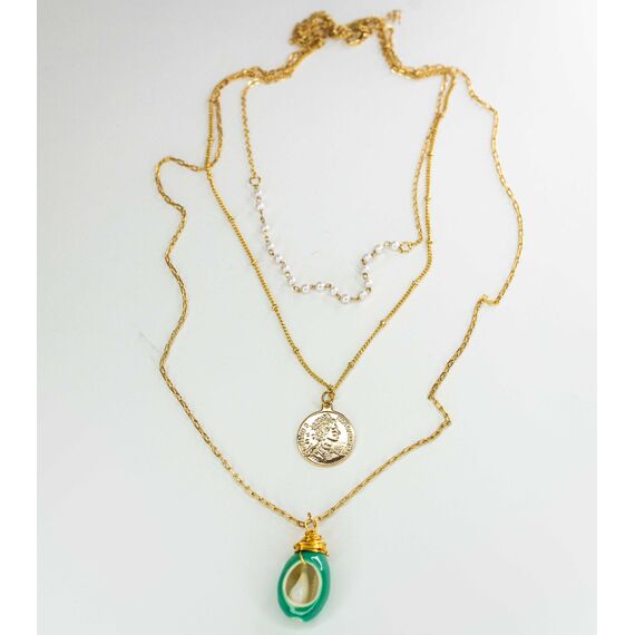 Колье многоярусное из гипоаллергенного ювелирного сплава желтого цвета. Состоит из трех цепей разного плетения с подвесками- бусины из иск.жемчуга, ракушка белого цвета, покрытая эмалью зеленого цвета и подвеской в виде монеты из ювелирного сплава. Длина колье-60,0+5см.
