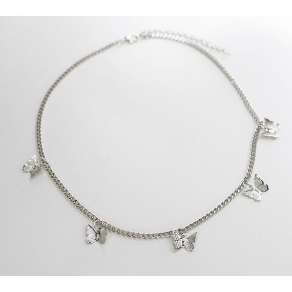 Колье (цепь) из гипоаллергенного ювелирного сплава серого цвета с подвесками в виде бабочек. Длина колье- 40,0+5,0см, замок-карабин.