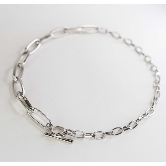 Колье (цепь) из гипоаллергенного ювелирного сплава серого цвета в виде эффектной цепи разных плетений. Длина колье- 40,0+5,0см, замок-тогл.