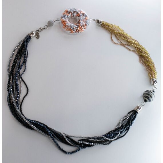 Колье женское из бисера черного, белого и желтого цвета. Вставка- муранское стекло серого и золотого цвета. Длина колье- 80,0см. Замок- карабин из ювелирного сплава.