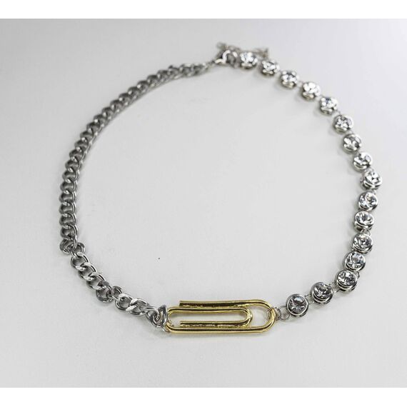 Колье из гипоаллергенного ювелирного сплава серого цвета . Состоит из крупной цепи и цепи со вставками из ювелирного стекла белого цвета. По центру колье- булавка из сплава желтого цвета со вставками из ювелирного стекла белого цвета. Длина-45,0+7см, замок - карабин.