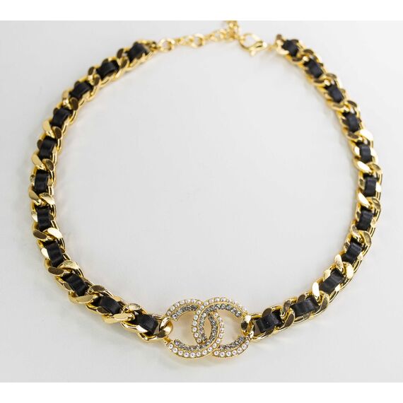 Колье ( чокер) из гипоаллергенного ювелирного сплава желтого цвета и кожи черного цвета. Вставка- иск. жемчуг и ювелирное стекло белого цвета. Длина колье- 40,0+5,0см, замок-карабин.