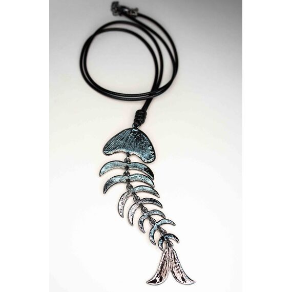 Колье из гипоаллергенного ювелирного сплава и текстиля. Состоит из плетеного текстильного шнура черного цвета и подвески (рыба) серого цвета. Высота подвески-13см, ширина-4см. Длина шнура-80,0+5см, замок- карабин.