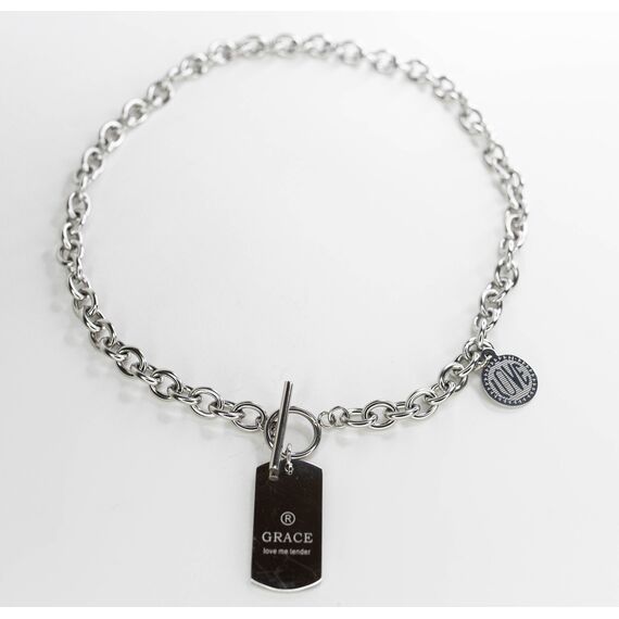 Колье (цепь) из гипоаллергенного ювелирного сплава серого цвета. Представляет собой цепочку (плетение- ролло) с двумя подвесками. Длина колье-45,0см, замок- тогл.