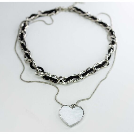 Колье (склаваж) из гипоаллергенного ювелирного сплава и замши. Одна цепь плотно облегает шею-40,0+7,0см, состоит из крупных звеньев, переплетенных с лентой из замши. Другая цепь (снейк) -50см с подвеской в виде сердца из ювелирного сплава, вставка - перламутр белого цвета.