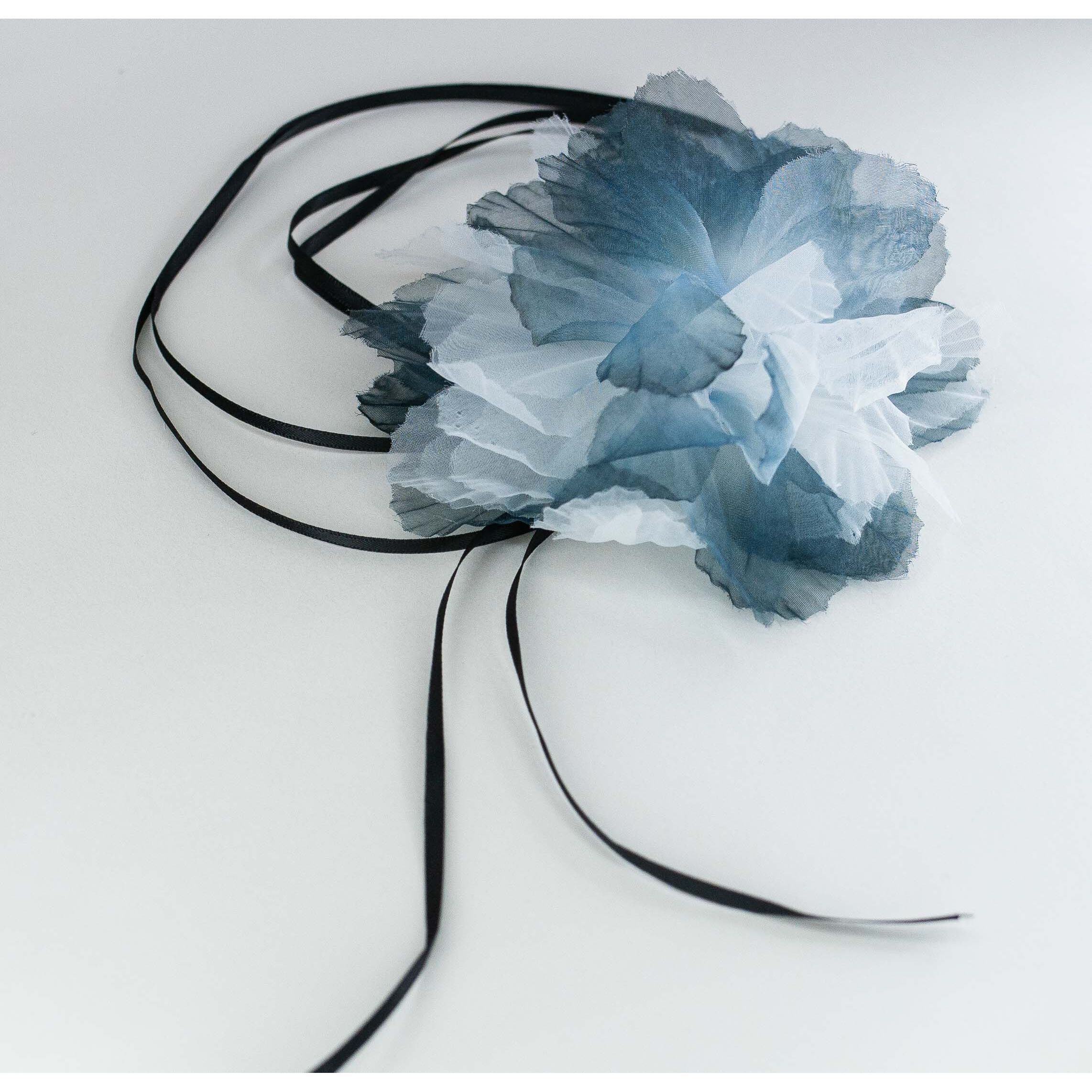 Чокер ( браслет на руку, пояс) из текстильной тесьмы черного цвета и капроновой ленты, цвет- бело-голубой.Размер цветка-8,0/8,0см. Длина тесьмы-1,0м.