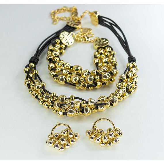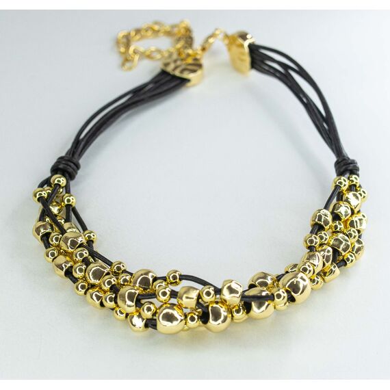 Колье из гипоаллергенного ювелирного сплава, цвет-желтый и кожи черного цвета. Колье представляет собой металлические шарики, нанизанные на кожаные шнурки. Длина колье-45,0+5см. Застежка- карабин.
