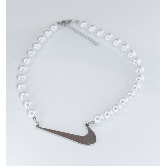 Колье (бусы) женское из бусин иск. жемчуга (диаметр-0,8см) белого цвета со вставкой в виде дуги из гипоаллергенного ювелирного сплава серого цвета. Длина колье- 40,0см, застежка- карабин.