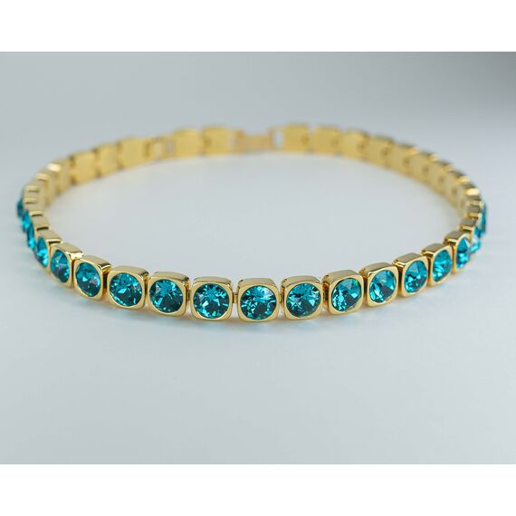 Колье-чокер из гипоаллергенного ювелирного сплава с покрытием- золочение. Вставка- кристалл Swarovski бирюзового цвета. Высота колье-1,0см, длина-40,0см. Застежка- клипса.