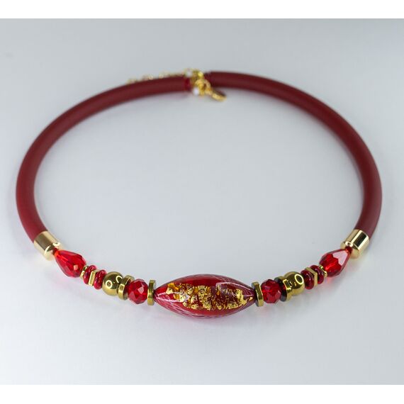 Колье женское ( чокер) из каучука, цвет-красный и гипоаллергенного ювелирного сплава желтого цвета. Вставка- муранское стекло, цвет- красный с принтом золотого цвета. Высота украшения из муранского стекла-2,0см. Длина колье-50,0см. Замок-карабин с удлиняющей цепочкой.
