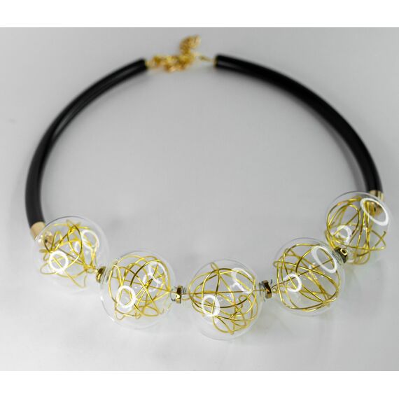 Колье женское ( чокер) из каучука, цвет-черный и гипоаллергенного ювелирного сплава желтого цвета. Вставка- муранское прозрачное стекло с принтом золотого цвета. Высота украшения из муранского стекла-3,0см. Длина колье-50,0см. Замок-карабин с удлиняющей цепочкой.