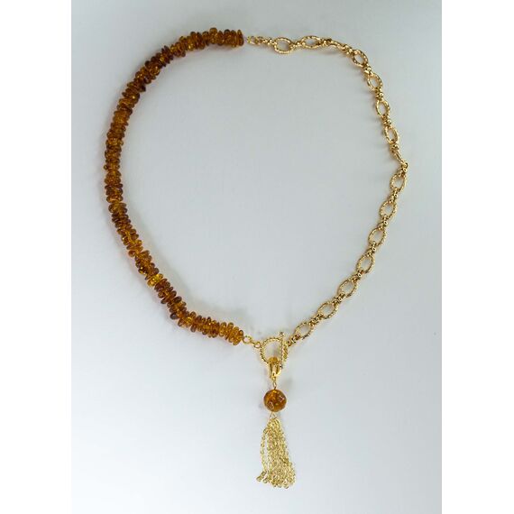 Колье (бусы) из натурального янтаря в виде плоских бусин (размер 1,0см), цвет- желто-коричневый с подвеской ( шарик), на цепочке из среднего размера звеньев из ювелирного гипоаллергенного сплава желтого цвета. Длина-45,0см, замок- тогл.