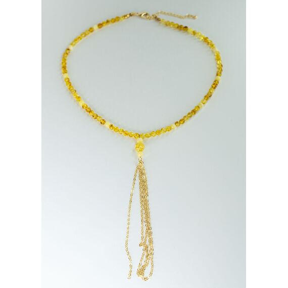 Колье (бусы) из натурального янтаря в виде круглых бусин (размер 1,0/1,0см), цвет- желтый и белый, с подвеской с цепочками из ювелирного гипоаллергенного сплава желтого цвета. Длина-45,0см, замок- шпрингельный.