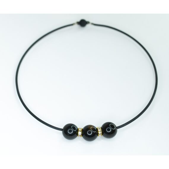 Колье (чокер) из натурального янтаря в виде круглых бусин (размер 1,0/1,0см), цвет- черный, со вставками из ювелирного гипоаллергенного сплава желтого цвета с фианитом, цвет- белый и каучука черного цвета. Длина-45,0см, замок- карабин с цепочкой на удлинение.