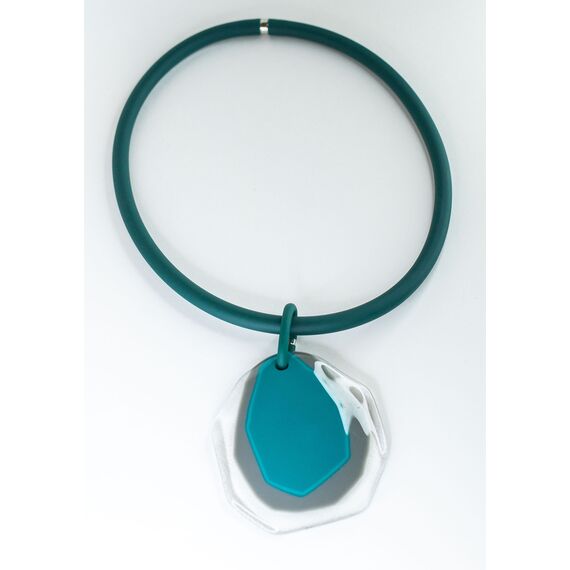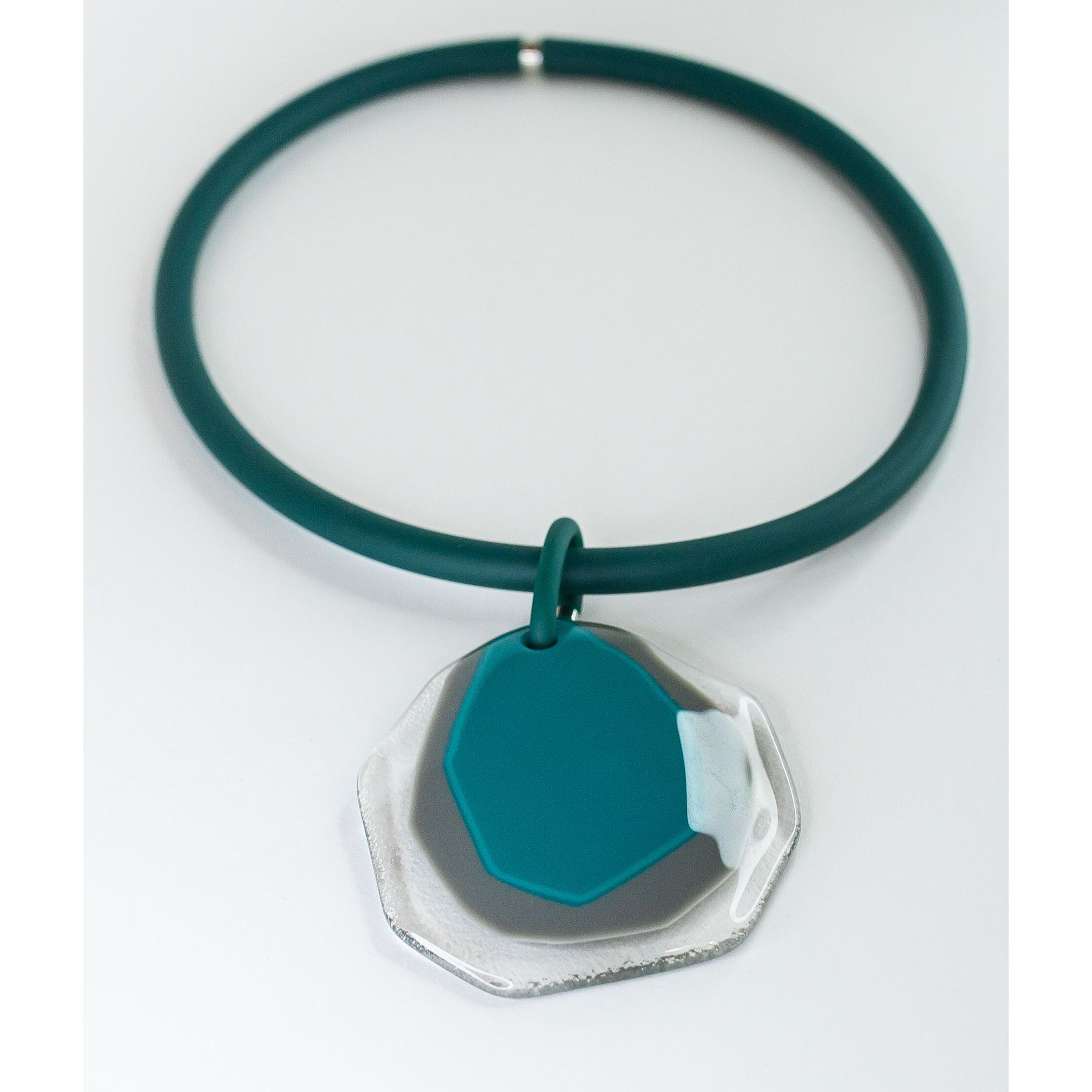 Колье женское из каучука, цвет-зеленый и гипоаллергенного ювелирного сплава серого цвета. Вставка- муранское стекло, цвет- белый, бежевый и бирюзовый. Высота украшения из муранского стекла-7,0см. Длина колье-45,0см с цепочкой на удлинение, замок- карабин.