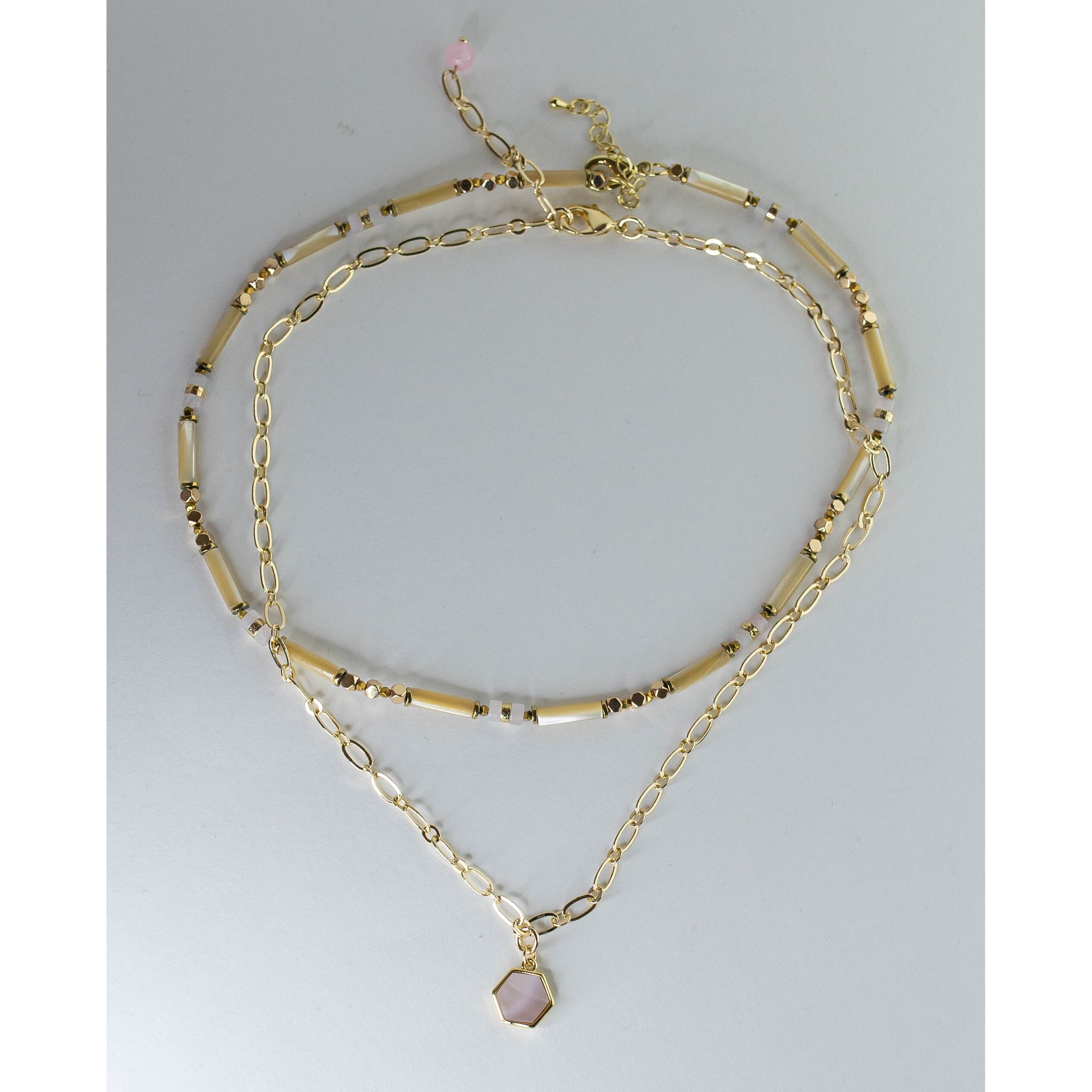 Колье женское- цепочка из гипоаллергенного ювелирного сплава желтого цвета и бусы из перламутра, цвет- белый, розовый и гематита. Высота бусин-1,0см, длина колье-50,0см, замок- карабин.