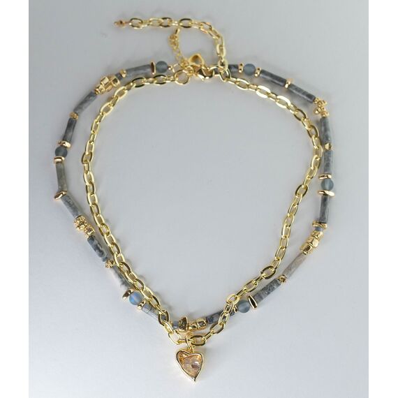 Колье женское- цепочка из гипоаллергенного ювелирного сплава желтого цвета и бусы из яшмы, цвет- серый, гематита и белого циркона. Высота бусин-1,0см, длина колье-50,0см, замок- карабин.