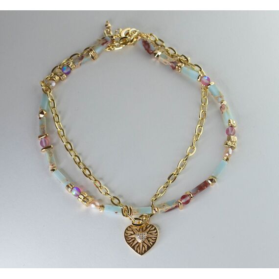 Колье женское- цепочка из гипоаллергенного ювелирного сплава желтого цвета и бусы из гематита, жемчуга розового цвета и варисцита, цвет-голубой и сиреневый. Высота бусин-1,0см, длина колье-50,0см, замок- карабин.