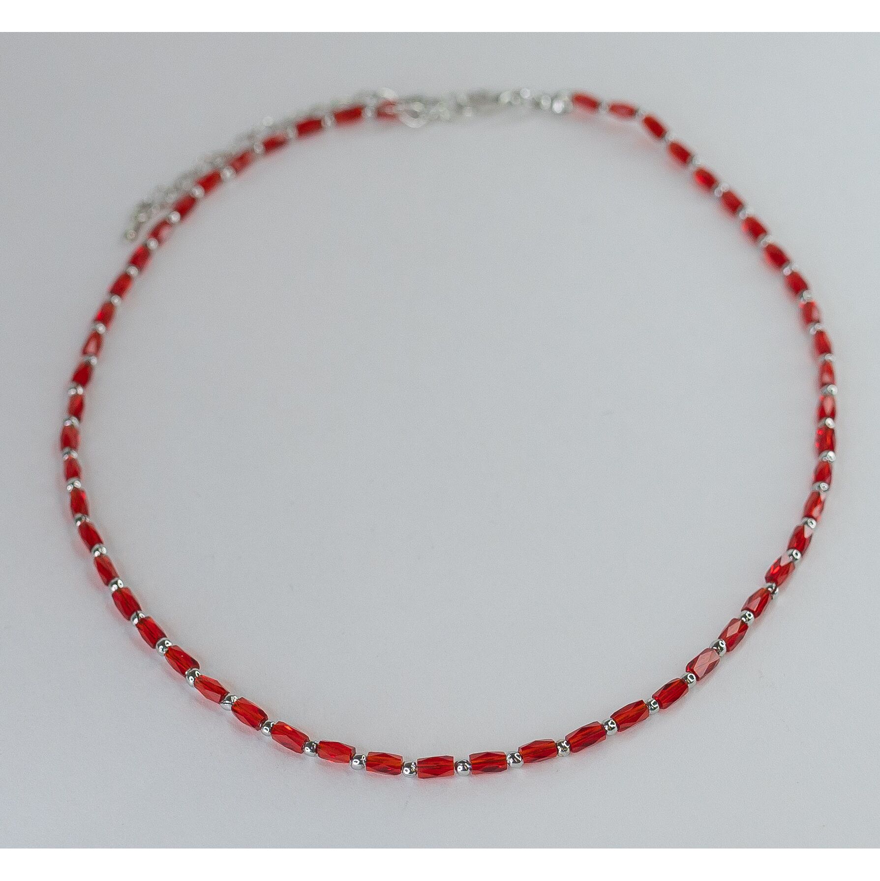 Колье (чокер) из гипоаллергенного ювелирного сплава серого цвета и бусин из кварца красного цвета. Высота бусин-0,3см, ширина-0,7см. Длина колье-40,0см с цепочкой на удлинение. Замок- карабин.