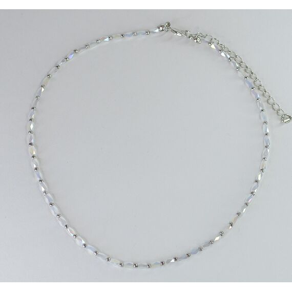 Колье (чокер) из гипоаллергенного ювелирного сплава серого цвета и бусин из кварца белого цвета. Высота бусин-0,3см, ширина-0,7см. Длина колье-40,0см с цепочкой на удлинение. Замок- карабин.
