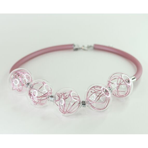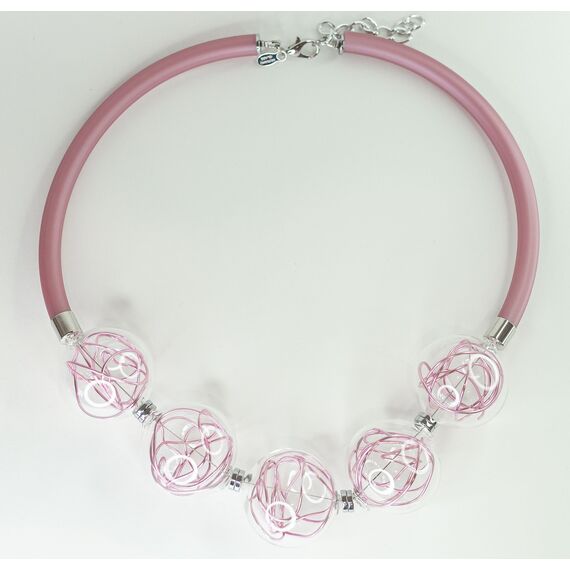 Колье женское из итальянского каучука розового цвета. Вставка- Муранское стекло белого и розового цвета. Длина колье-50,0см. Замок- карабин с удлиняющей цепочкой.