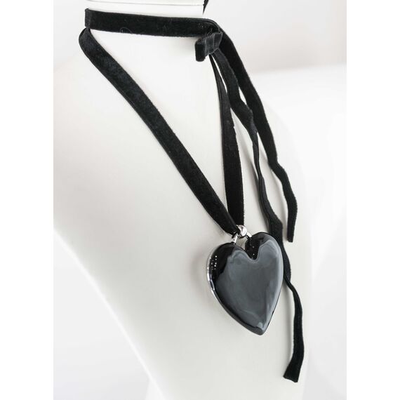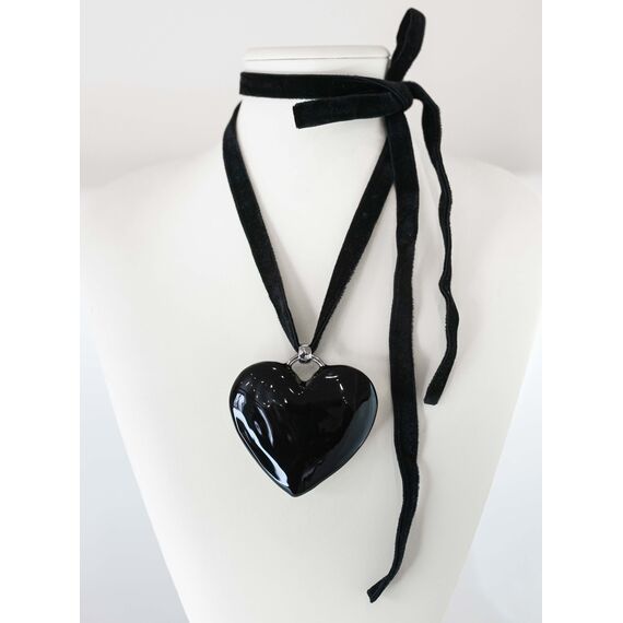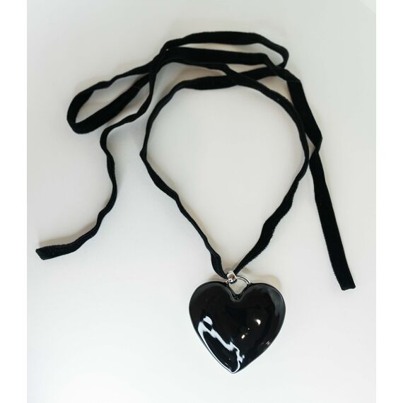 Колье женское из высококачественного гипоаллергенного ювелирного сплава серого цвета с подвеской, покрытой черной эмалью. Высота подвески-5,0см. Длина колье регулируется текстильной лентой черного цвета. В комплект входит прорезиненный шелковый шнурок черного цвета, длиной-45,0см, с замком- карабин.