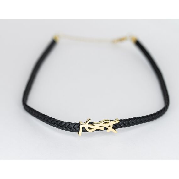 Колье из кожаного шнура черного цвета с подвеской из высококачественного гипоаллергенного ювелирного сплава желтого цвета. Длина колье- 40,0см с удлиняющей цепочкой. Замок- карабин.