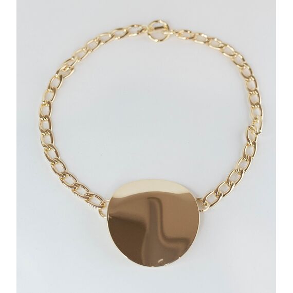 Колье женское (цепь с элементом в виде круглой пластины, диаметром-5,0см)) из гипоаллергенного ювелирного сплава желтого цвета. Без вставок. Длина колье-50,0см с удлинением. Замок- карабин.