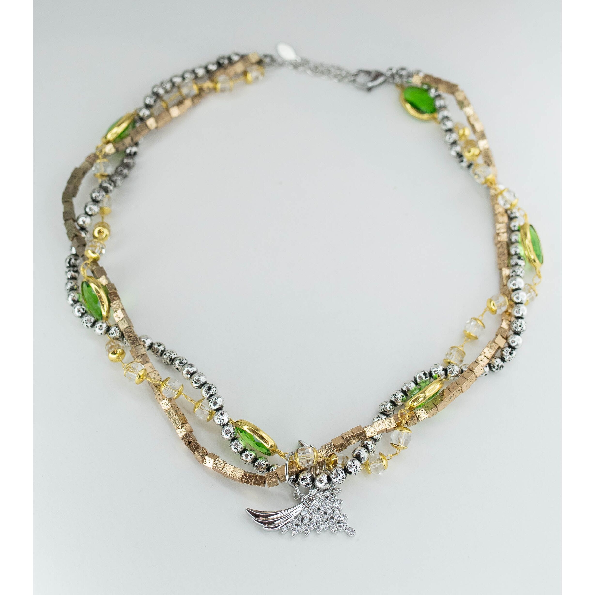 Колье женское представляет собой переплетенные три цепи разного плетения из гипоаллергенного ювелирного сплава желтого и серого цвета. Вставка- ювелирное стекло зеленого цвета. Высота вставок-2,0см. Длина колье -50,0см , замок- карабин.
