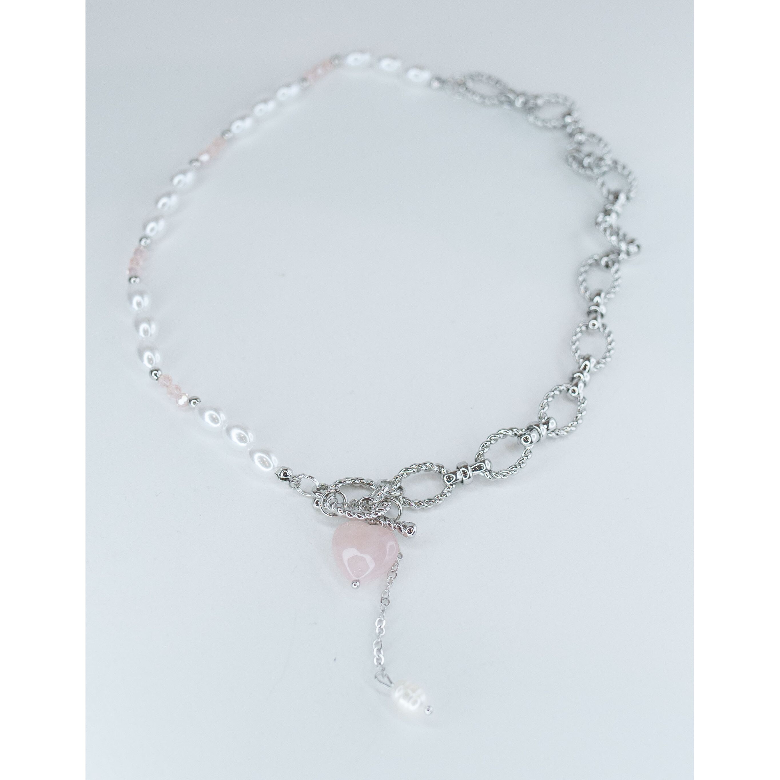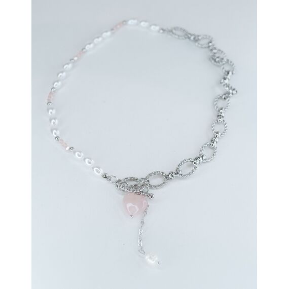 Колье женское состоит из бусин майорки белого цвета, (диаметр-1,0см) с подвесным элементом из кварца розового цвета и цепочных звеньев из гипоаллергенного ювелирного сплава серого цвета. Длина колье-45,0см. Замок- тогл.