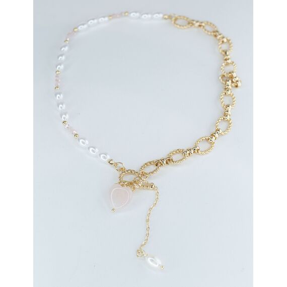 Колье женское состоит из бусин майорки белого цвета (диаметр-1,0см) с подвесным элементом из кварца розового цвета и цепочных звеньев из гипоаллергенного ювелирного сплава желтого цвета. Длина колье-45,0см. Замок- тогл.