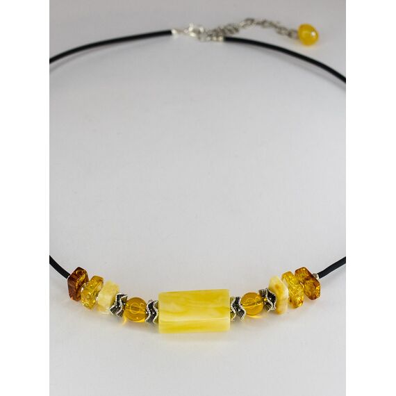 Колье из каучукового шнура и бусин из натурального янтаря желтого и коричневого цвета разных величин (1,0-2,0см). Длина колье-40,0см. Замок- карабин с удлиняющей цепочкой из гипоаллергенного ювелирного сплава серого цвета.