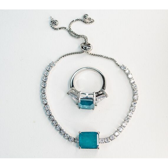 Комплект из гипоаллергенного ювелирного сплава серого цвета.Состоит из браслета со вставками из ювелирного стекла белого и бирюзового цвета,застежка - регулируемая. Кольцо со вставками из ювелирного стекла белого и бирюзового цвета . Высота кольца-1см, ширина-2,5см. Размер-18,0.