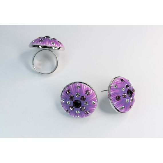 Комплект (серьги+ кольцо) из гипоаллергенного ювелирного сплава серого цвета. Покрытие- эмаль фиолетового цвета. Вставка-ювелирное стекло, цвет- белый, розовый, сиреневый. В серьгах итальянский замок ( швенза-1,2см и застежка-клипса). Диаметр серег и кольца---3см. Кольцо разъемное(безразмерное).