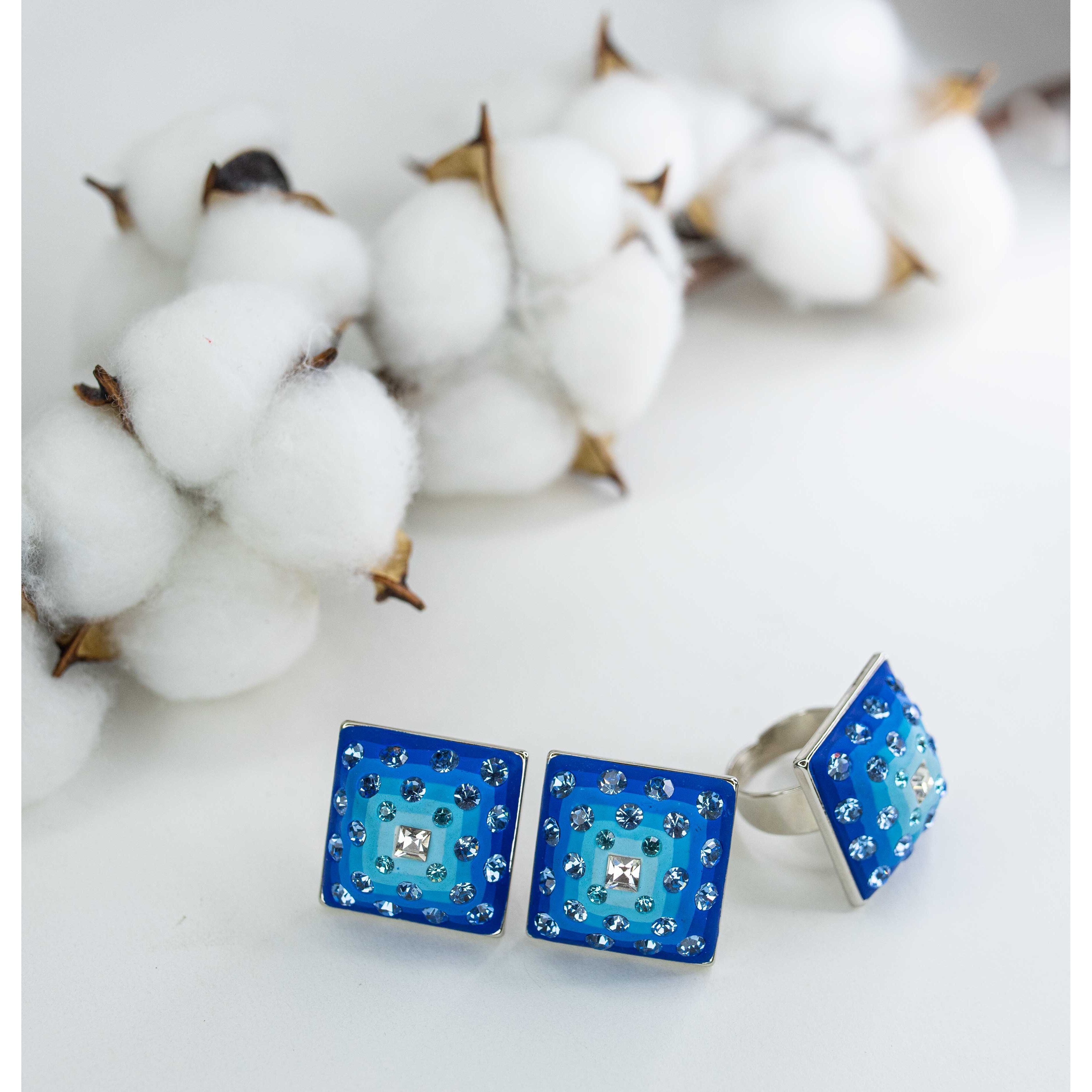 Комплект (серьги+кольцо) из гипоаллергенного ювелирного сплава серого цвета. Покрытие- эмаль синего цвета.Вставка- ювелирное стекло- цвет-синий, голубой, белый. В серьгах-итальянский замок( швенза-1,2см и застежка-клипса).Высота и ширина серег и кольца-2,5см. Кольцо-разъемное( безразмерное).
